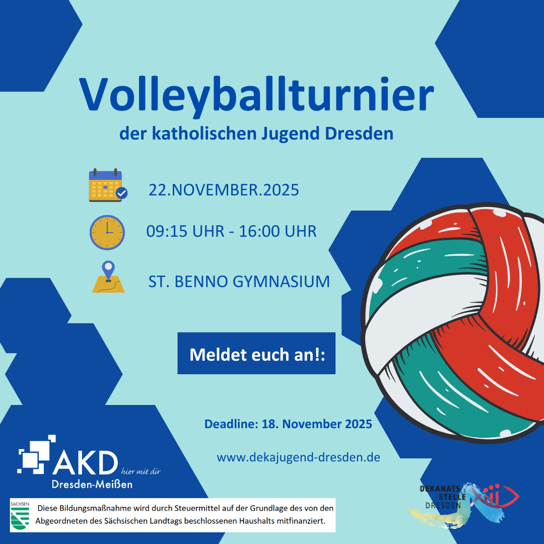 wir, die katholische Jugend im Dekanat Dresden, laden euch zu unserem Volleyballturnier am 22.11.2025 in der Turnhalle des St. Benno-Gymnasium ein.