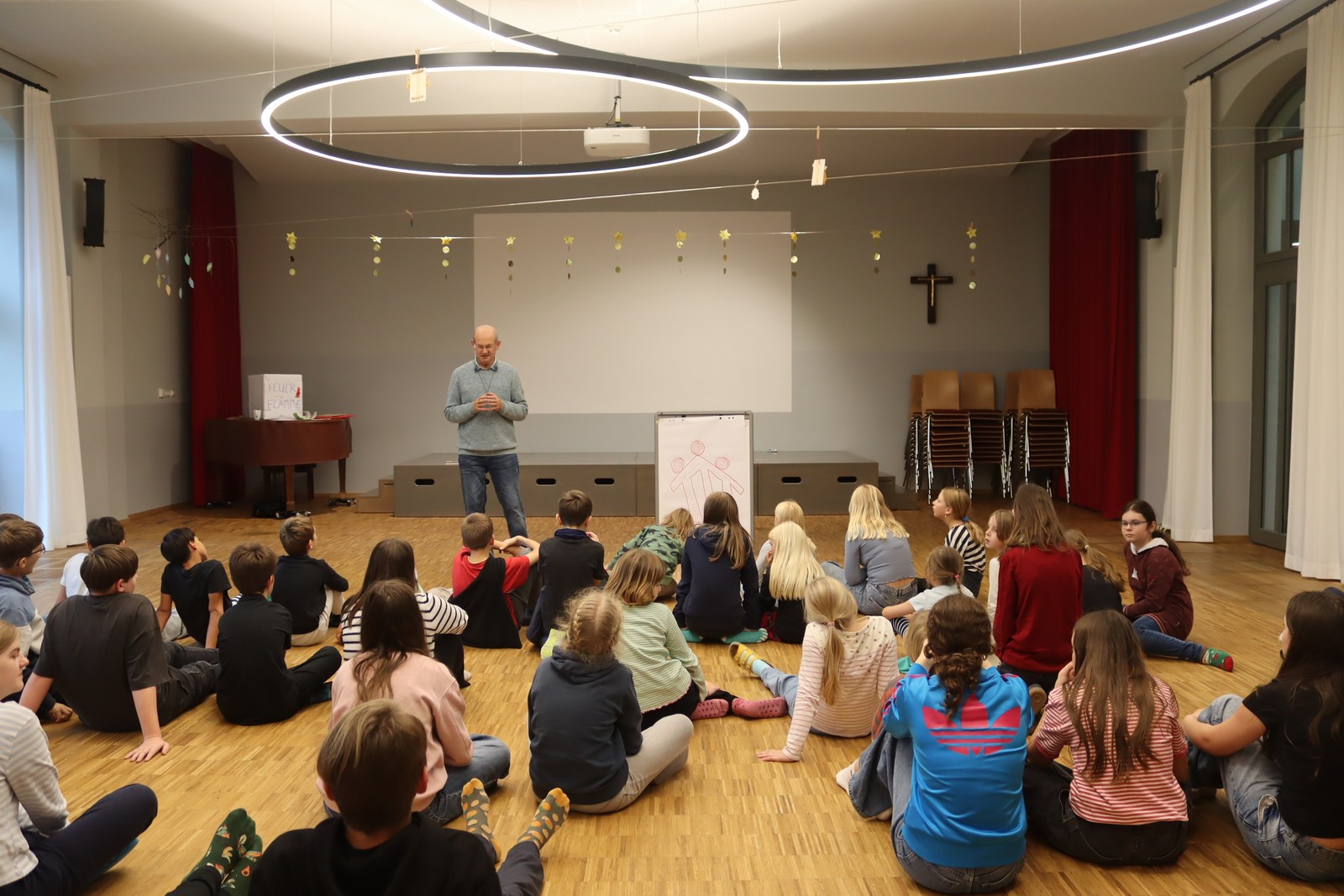 Der Freitag stand im Zeichen des Dankes und des Abschieds. In einer feierlichen Andacht blickten die Teilnehmenden auf die Woche zurück. Symbolisch drehte sich dabei alles um einen Würfel, der die Schülerinnen und Schüler bereits die ganze Woche begleitet hat – jede Seite stand für ein Thema der vergangenen Tage. Mit jedem Symbol erinnerten sich die Kinder daran, was sie in dieser Woche gelernt hatten: Dass Gott immer bei uns ist, dass wir mit Herz und Hand Gutes tun können und dass Freude ansteckend ist.