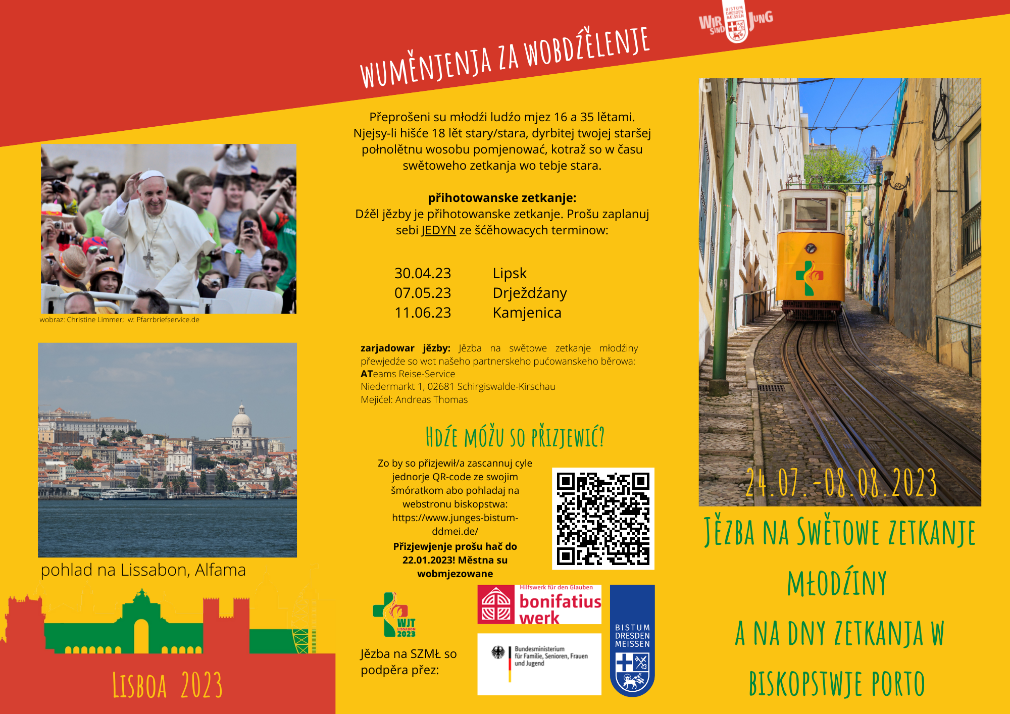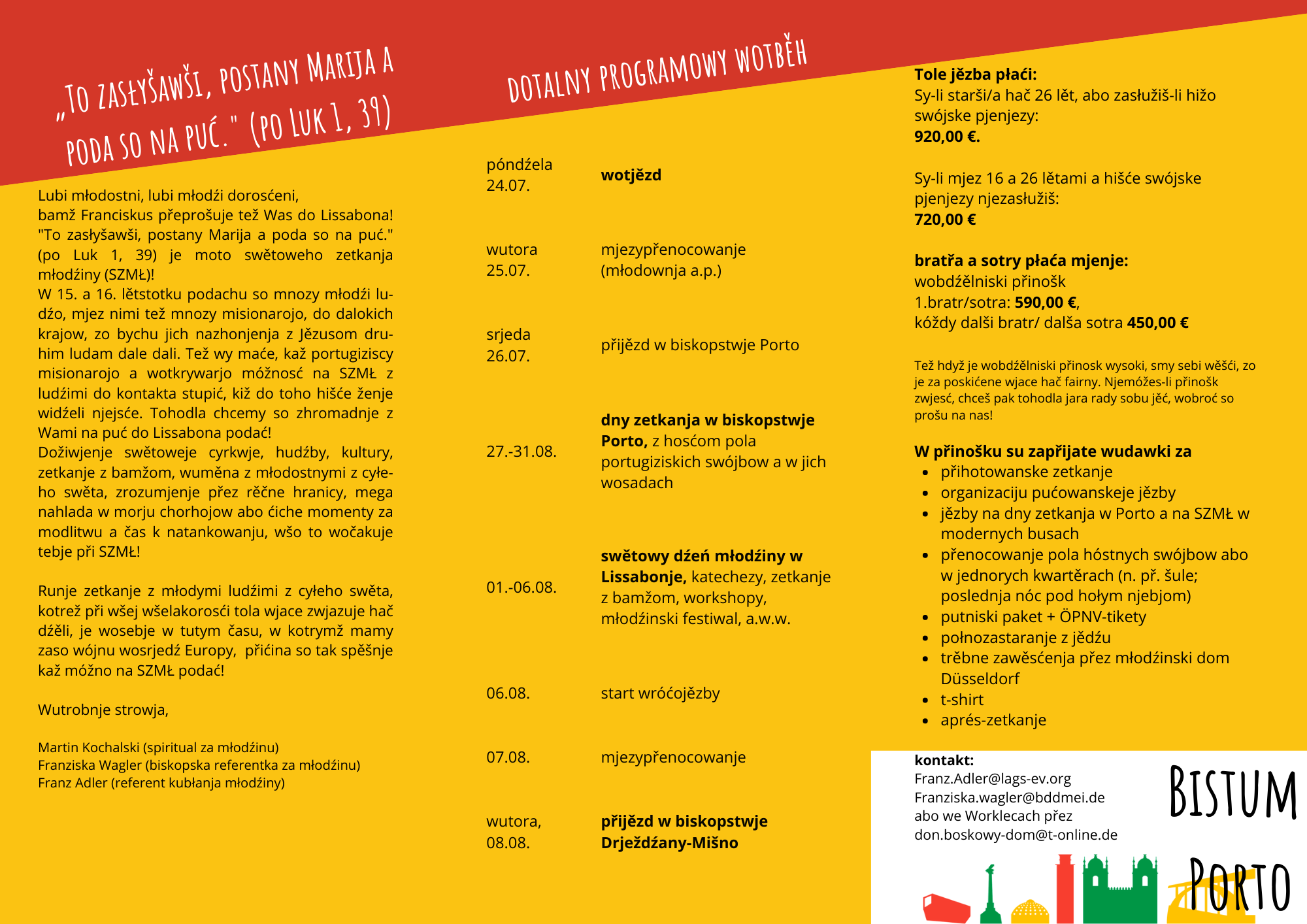 Hdyž chceće sej z fararjom Gabrišom Nawku a ze mnu ze serbskej skupinu na swětowe zetkanje młodźiny do Lissabona dojědź, dźiwajće na to, zo pola "Großgruppe" wotpowědnu kategoriju wuzwoliće. Pak za "Bistum Dresden-Meißen (Sorbischsprachige Jugendliche/junge Erwachsene" abo "Sorbischsprachige Jugendliche/junge Erwachsene aus dem Bistum Görlitz".